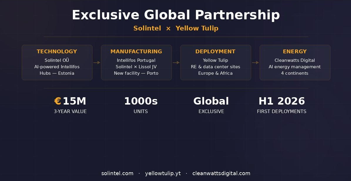 Today we announced an exclusive, multi-year global partnership between Solintel Ltd and Yellow Tulip Inc for the deployment of thousands of Intellifos Hubs — our AI-powered, fully autonomous smart lighting solutions — as standard infrastructure across Yellow Tulip’s renewable energy and data center sites in Europe and Africa.